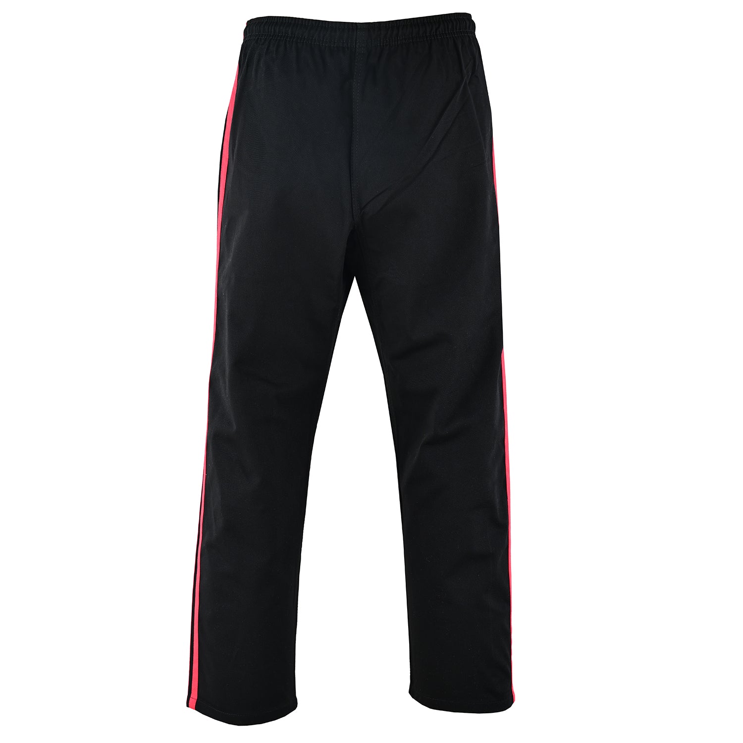 Medium Weight Full Contact Trousers, Suitable for All styles of Martial Arts. Made of 100% cotton. With Elasticated Waist band. Trousers are all Black in colour, with to contrasting Red stripes on both sides of the trouser.