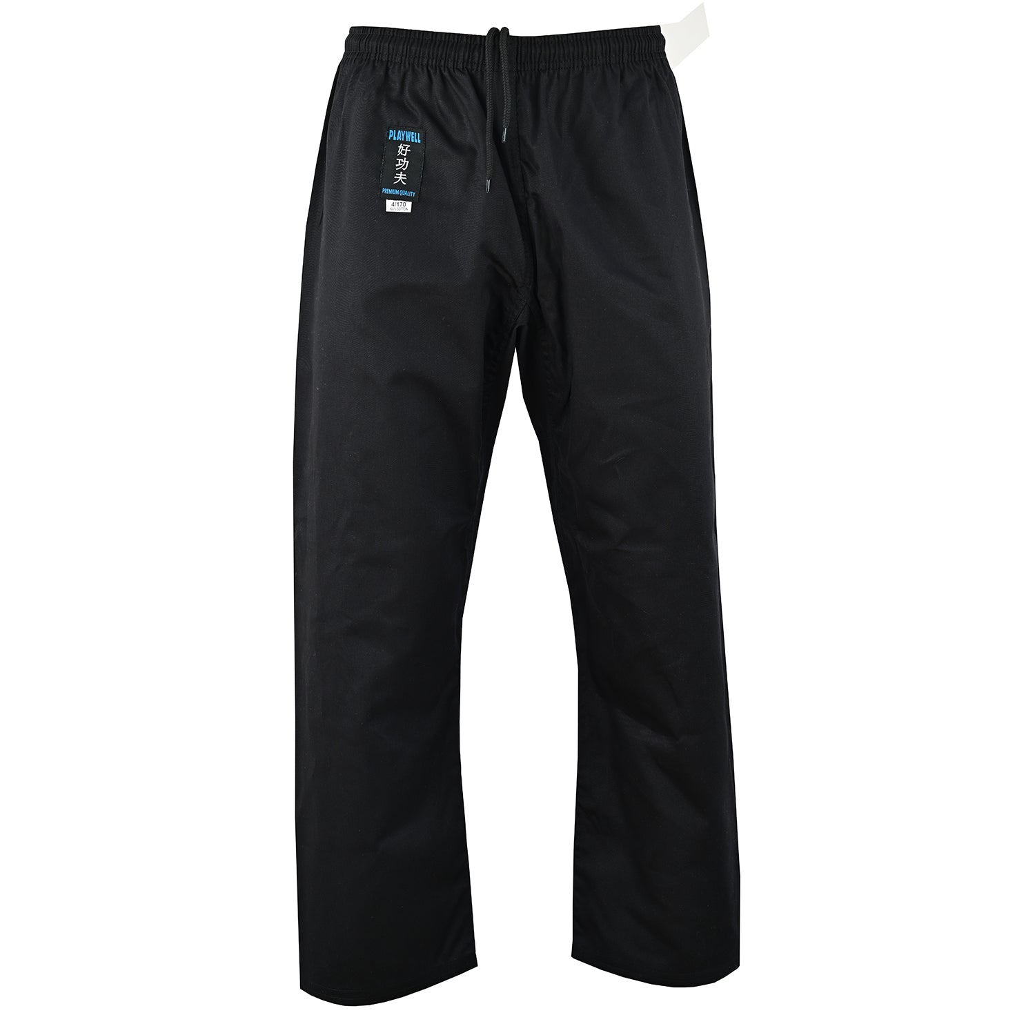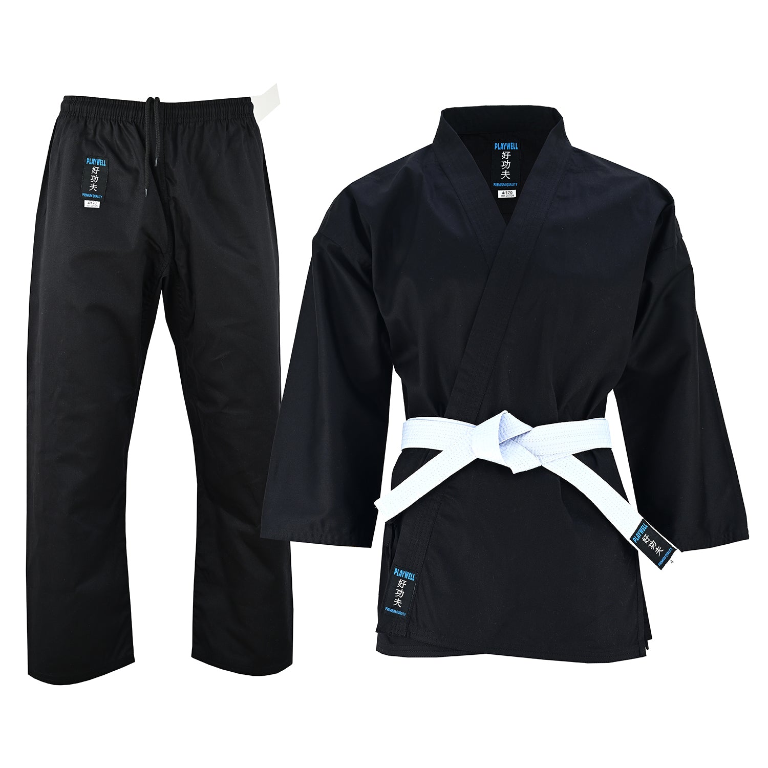Student Karate Suit. 7oz Black. POLYCOTTON. Complete with Belt. Trousers with Elastic and Cord Waist for all sizes. Excellent Karate Uniform made with finest Bleached Cotton. Karate Black Suits are Medium Weight 8oz 100% Cotton and of top quality and designed for comfort fit to give you a greater range of movement. There is no other match to Playwell Uniforms.