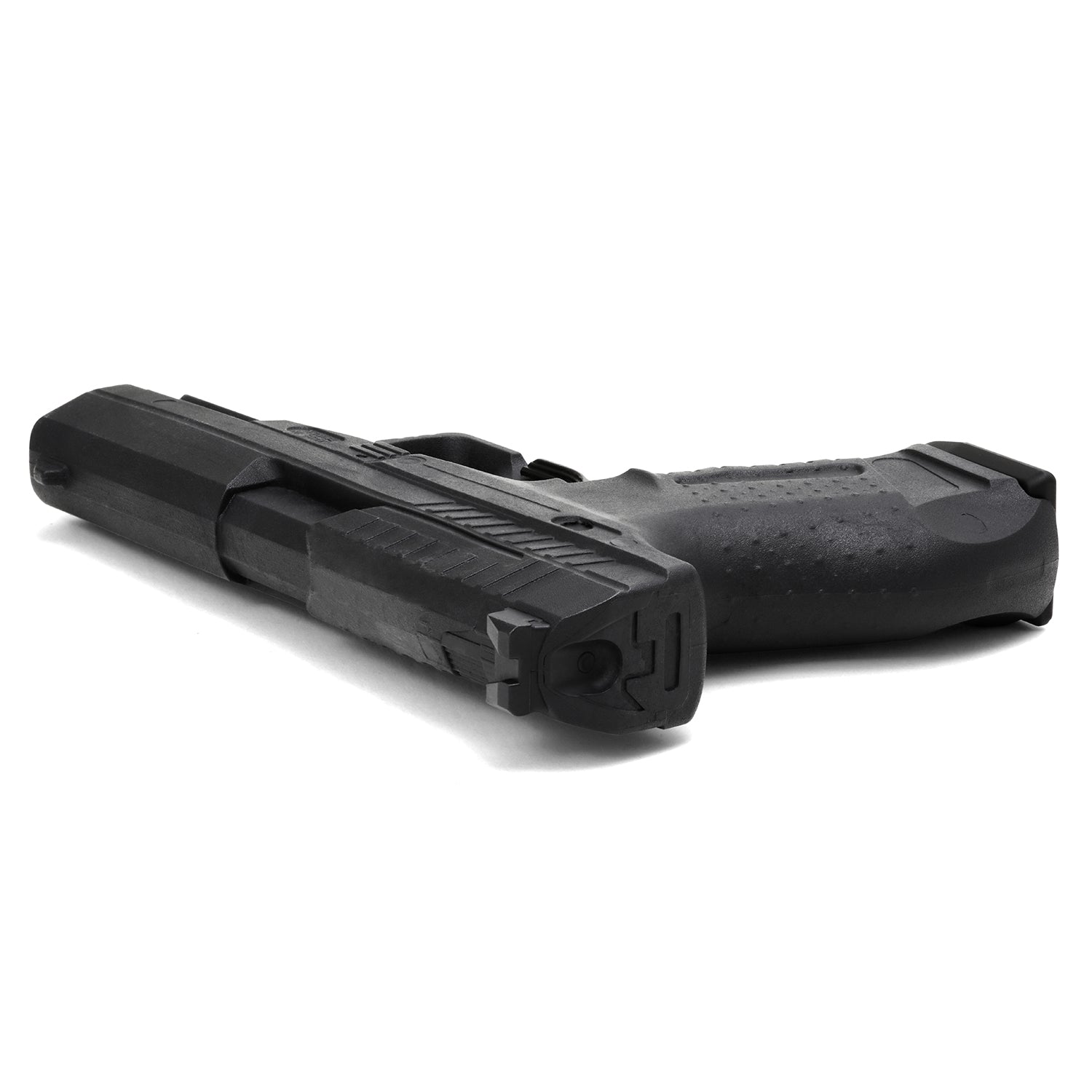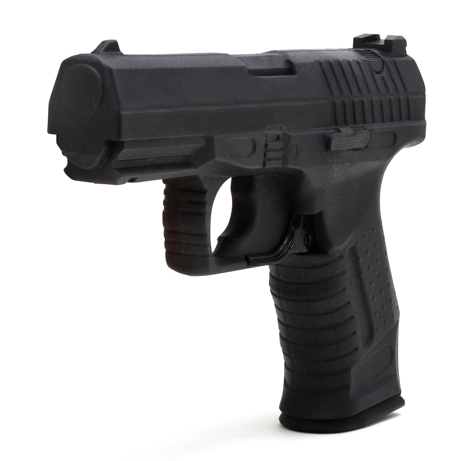 Black rubber hand gun replica with mock trigger. Realistic design by Playwell for use and training in method of non-deadly force. Now with a Removeable Magazine, Measures: 7.5 inches in length and 5 inches width. Weighs 1 pound. Colour of the gun is Black,