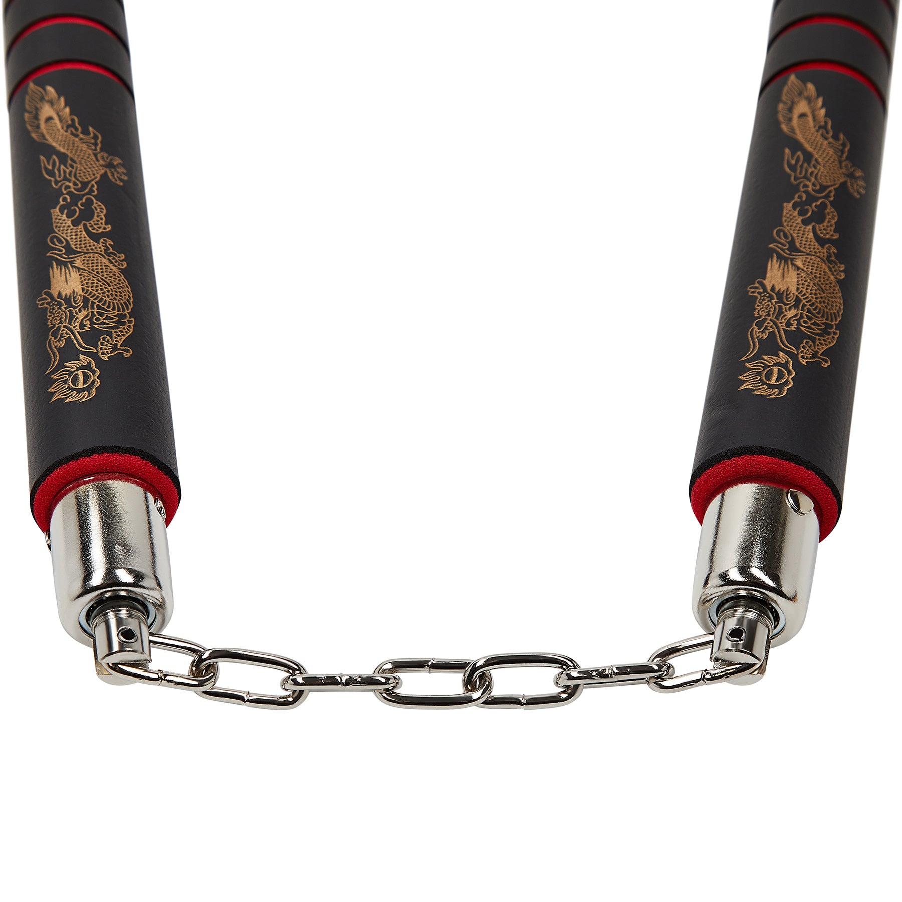New Foam Nunchaku With Metal Ball bearing chain. Black Foam with Printed Dragon Design and red grips Total Length 12 inches. Length of chain approx: 5.5 inches, Diameter Approx 1.2 inches.